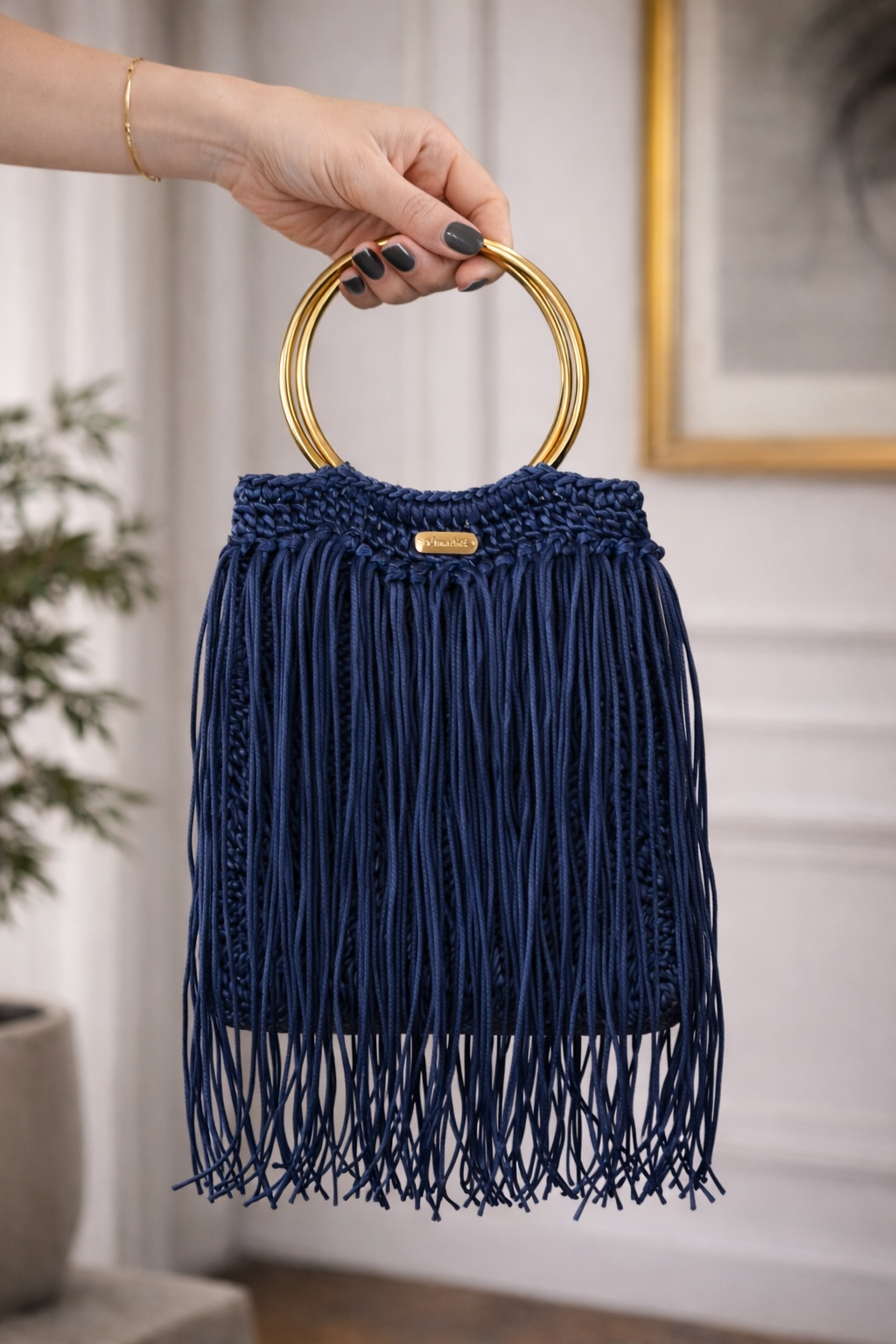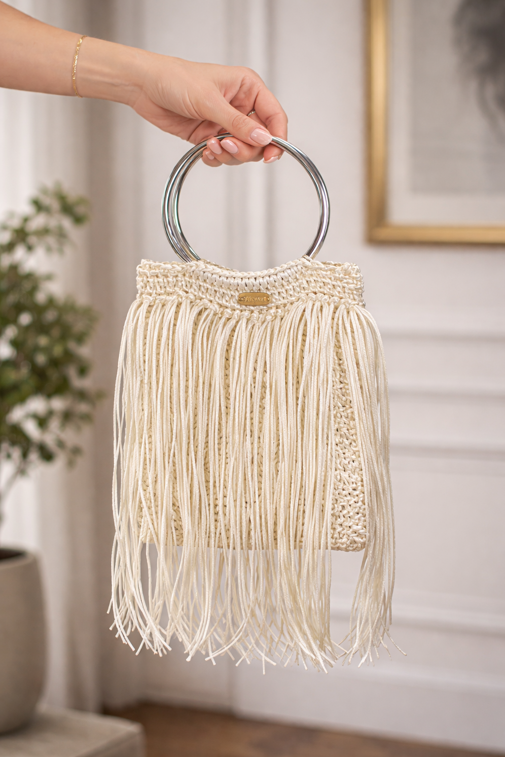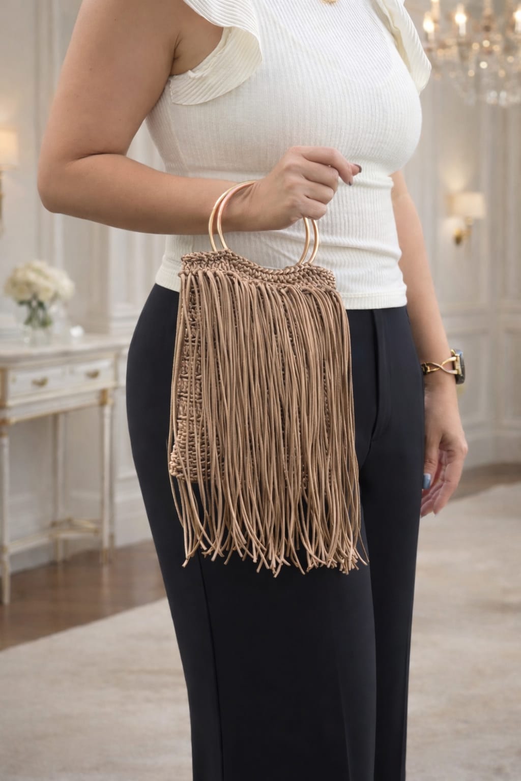 Su diseño destaca por un movimiento fluido gracias a sus flecos largos y un contraste de texturas exquisito. El asa metálica circular en tono oro aporta ese toque de elegancia necesario para transicionar de un evento de día a una cena especial.