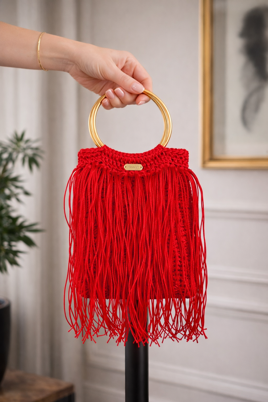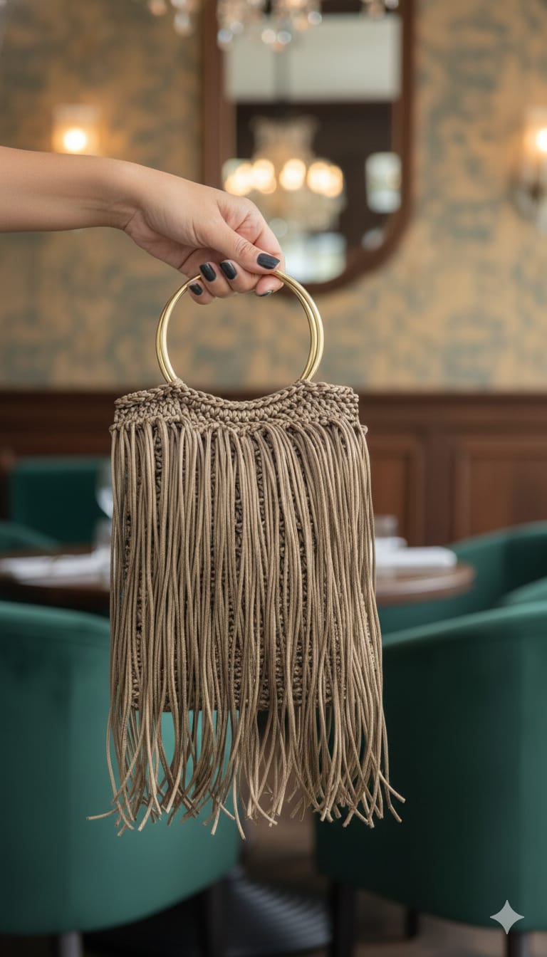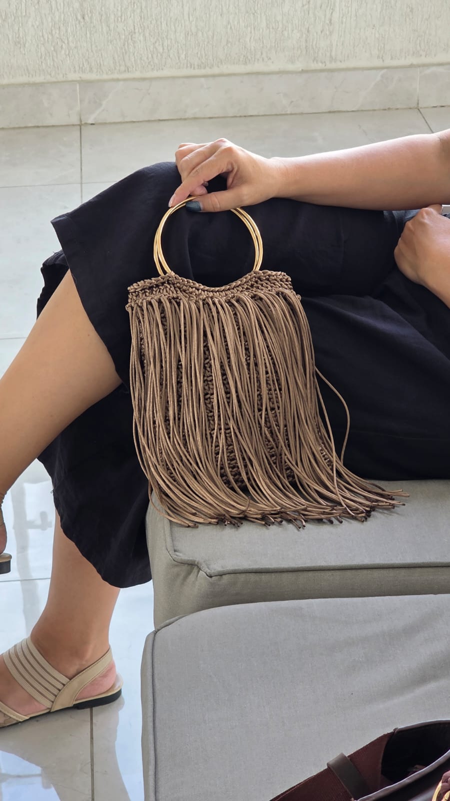 Su diseño destaca por un movimiento fluido gracias a sus flecos largos y un contraste de texturas exquisito. El asa metálica circular en tono oro aporta ese toque de elegancia necesario para transicionar de un evento de día a una cena especial.