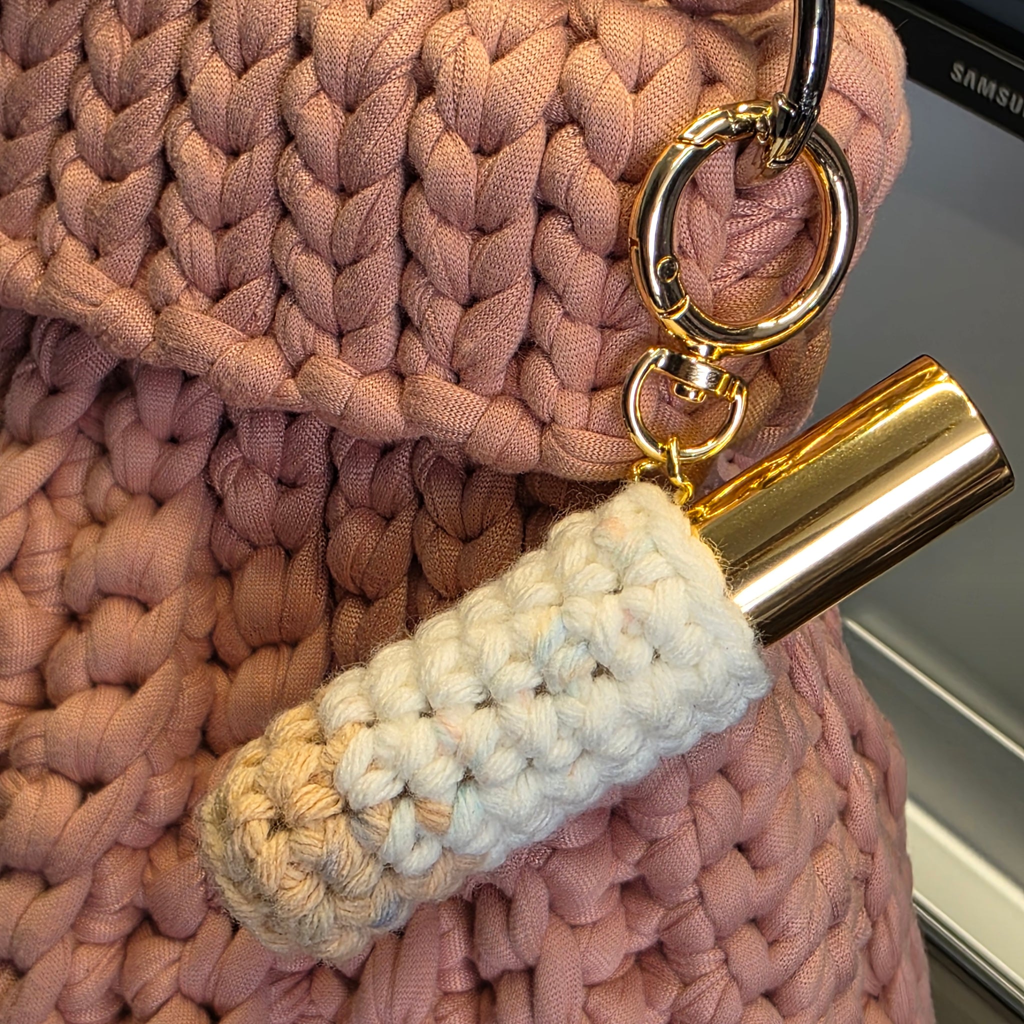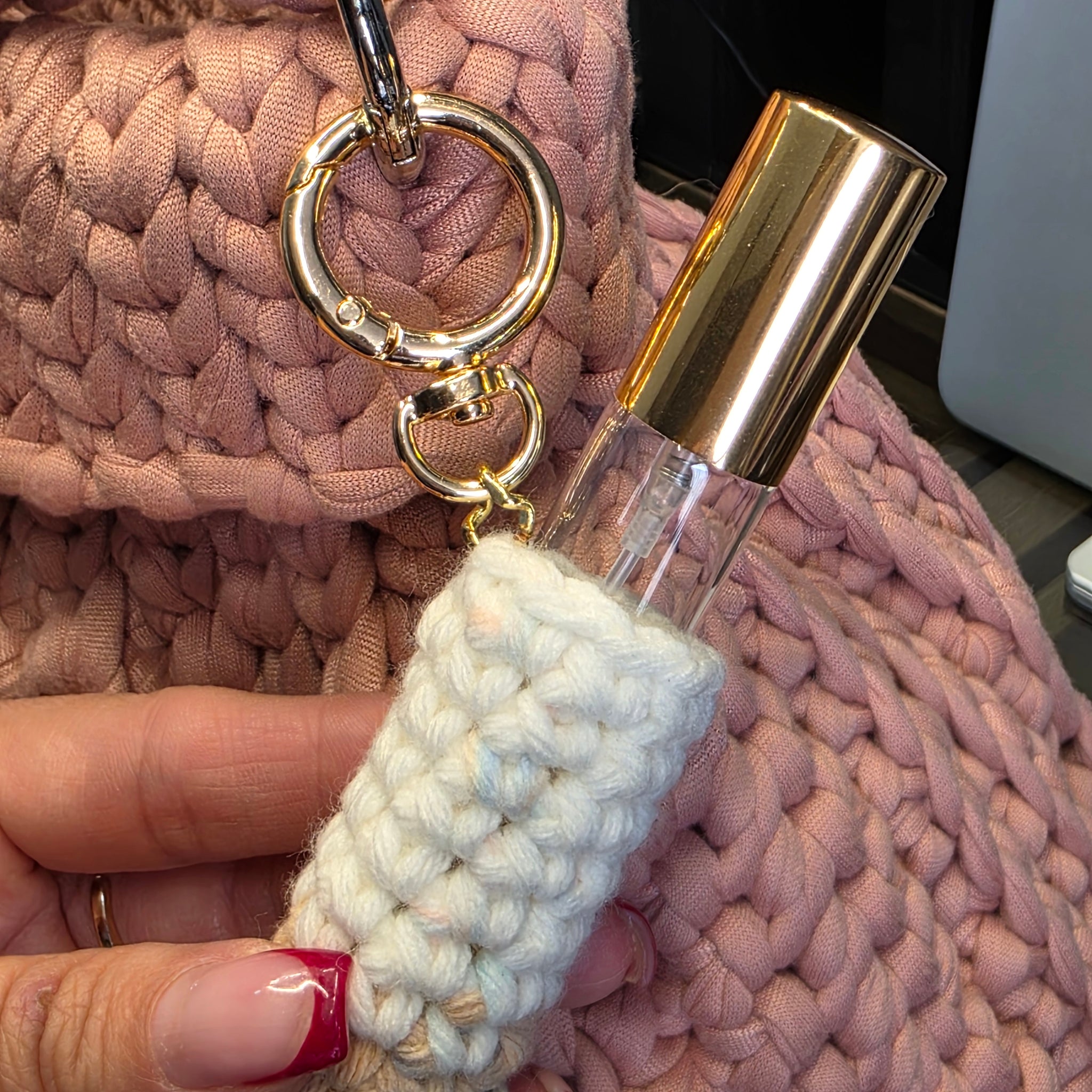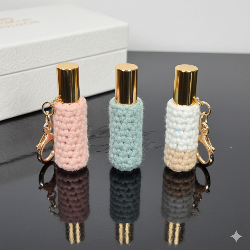 Este Mini-Atomizador Decorativo es el accesorio de lujo que faltaba en tu bolso. El frasco está protegido por una delicada funda tejida a crochet, convirtiéndolo en un encantador charm colgante.