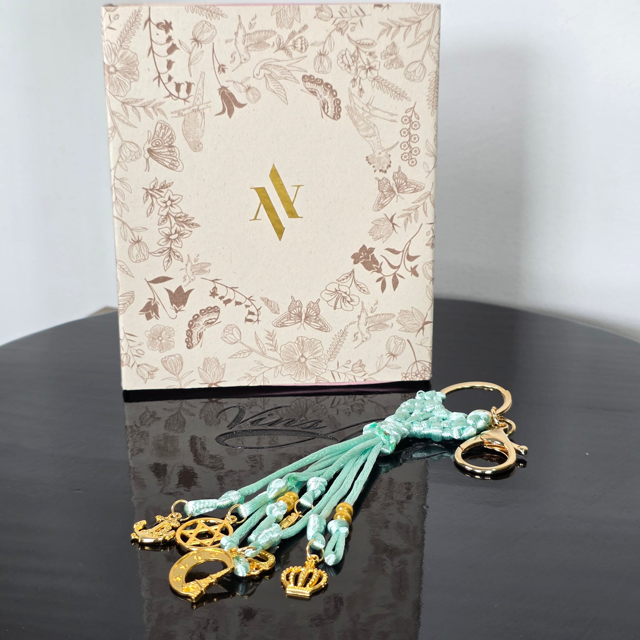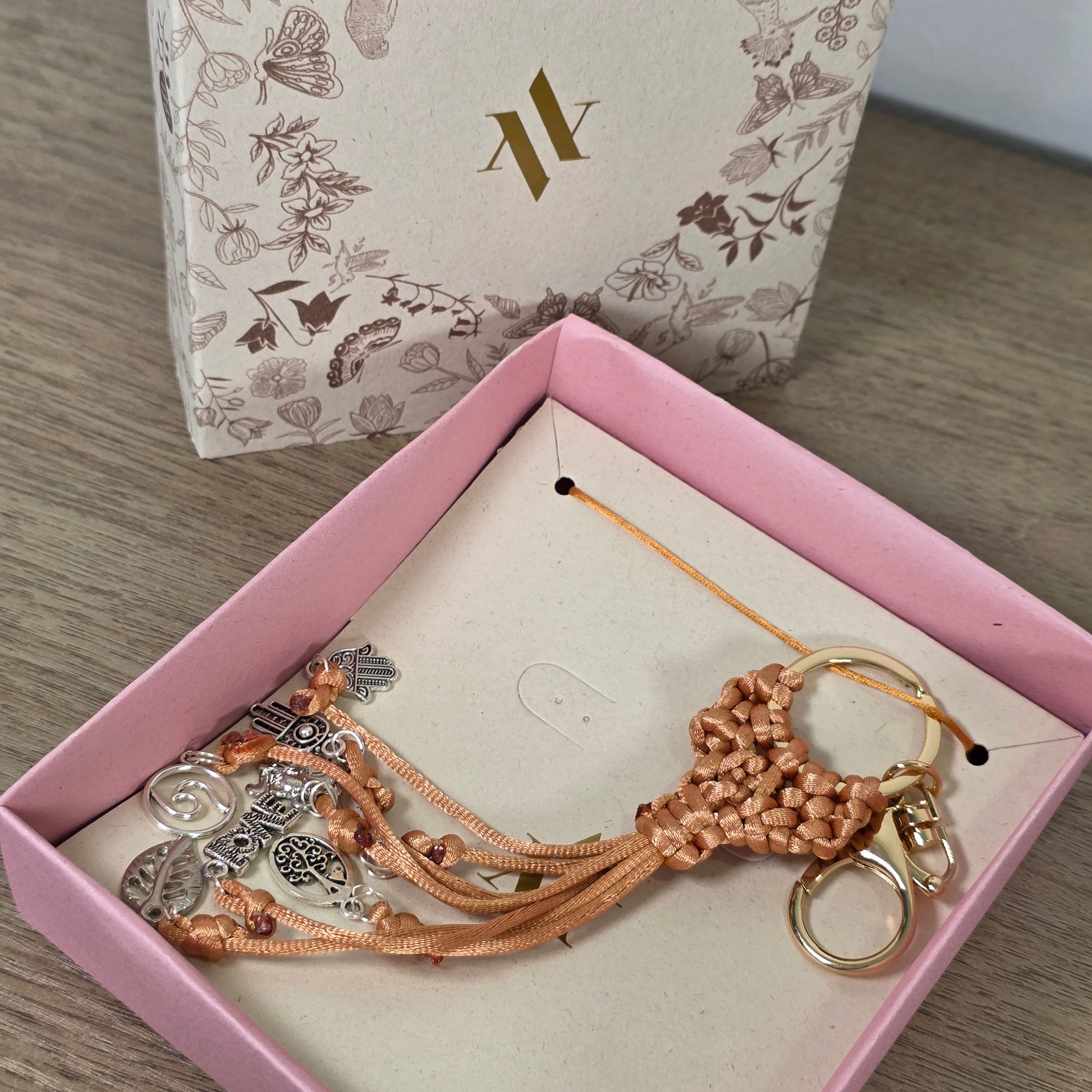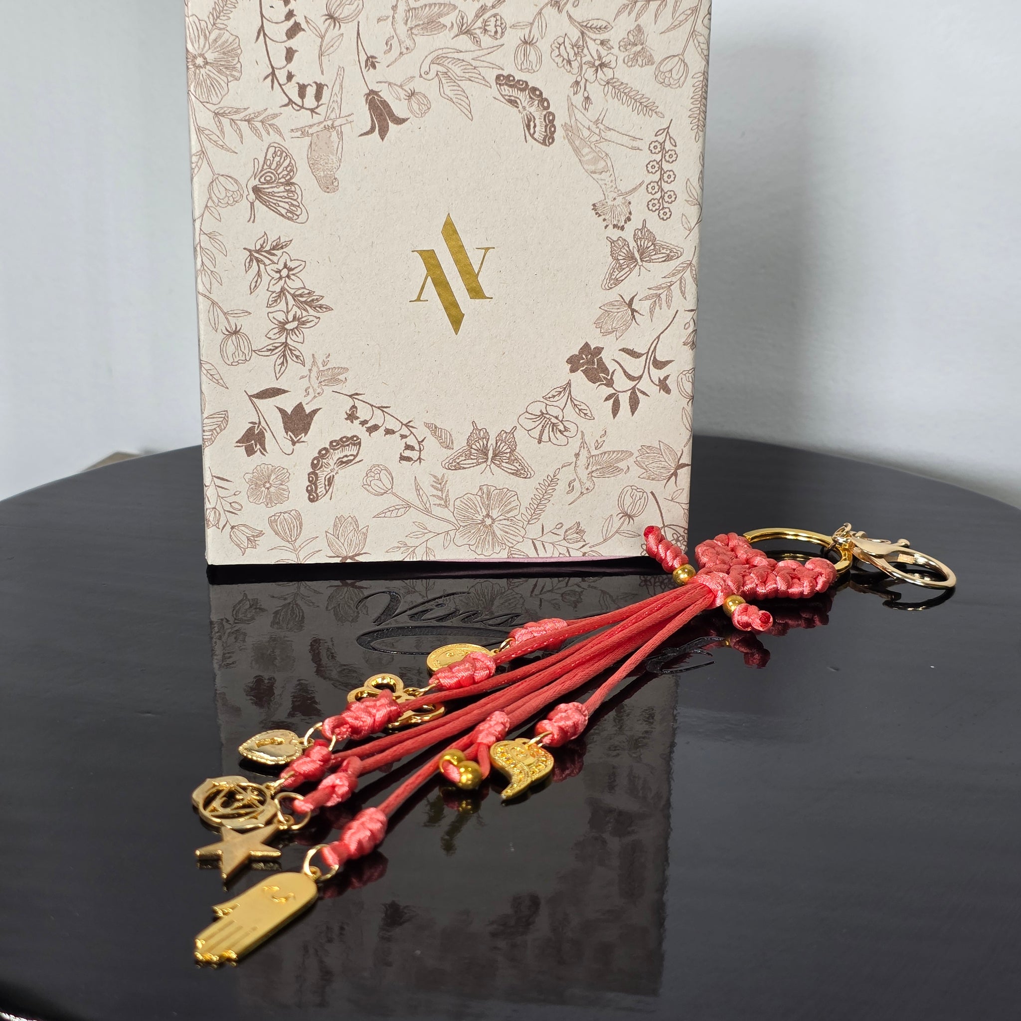 Este exclusivo Charm/Llavero está cuidadosamente tejido a mano con un vibrante cordón rojo. Diseñado para colgar como un accesorio único, incorpora diferentes dijes (ejm. mano de Fátima, corazón, estrella).